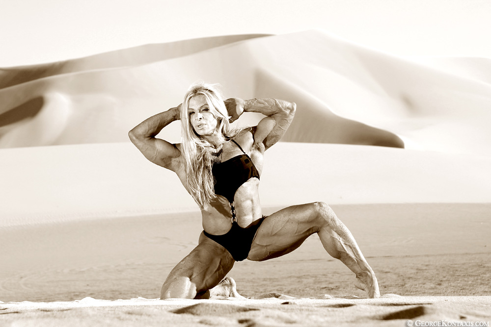 30 September 2014: Female bodybuilder Debi Laszewski at the Mojave sand dunes! |